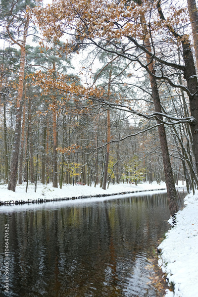 river and trees covered first snow in autumnal park. autumn landscape nature image. snowy cold weather. late fall or early winter season. melancholy atmosphere