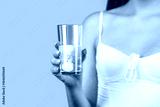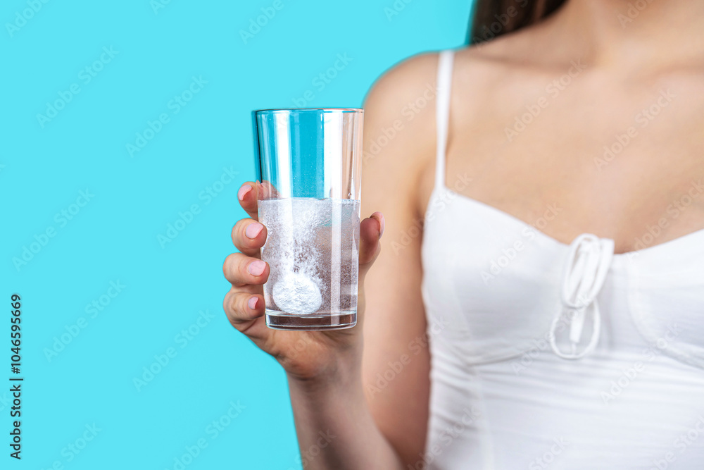 Glass of water tablet. Glass with effervescent tablet in water with bubbles. White pill and a glass of water in woman hands. Health concept. Close up of girl holding a pill