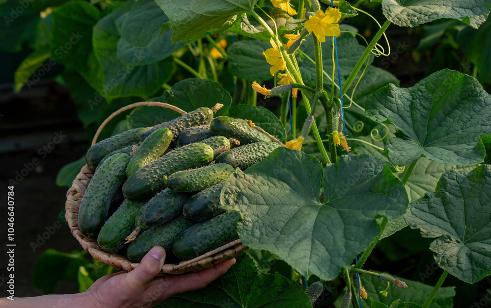 Farmer holding a basket of fresh organic cucumbers in his hands. Selective focus