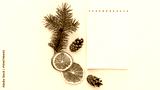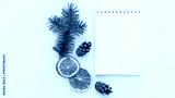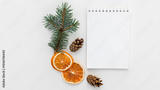 Creative holiday composition with blank notebook mock up, dried orange and pine cone on white background. To do list, planner and goals concept. Christmas, autumn concept. Flat lay, top view