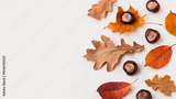 Autumn holiday frame composition with dry leafs and chestnuts on white backround. Creative layout pattern, Thanksgiving day flat lay, Halloween. Eco zero waste concept. Top view, place for text banner