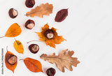 Autumn holiday frame composition with dry leafs and chestnuts on white backround. Creative layout pattern, Thanksgiving day flat lay, Halloween. Eco zero waste concept. Top view, place for text banner