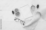 Workspase with notebook, glasses, cozy scarf and cup of coffee with milk on white wooden background. Autumn creative composirion flat lay. Work, online education, goals to do list, home office concept