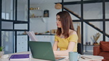 Remote manager reviewing documents sitting at laptop modern apartment closeup.