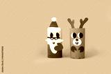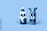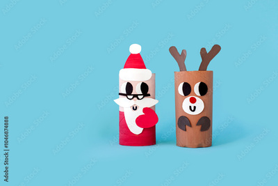 Christmas toy from toilet tube roll, paper toy santa claus, snowman, reindeer, tree on blue background. Holiday easy DIY for kids, decoration idea for winter season home xmas party. Children's crafts