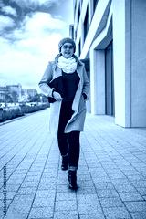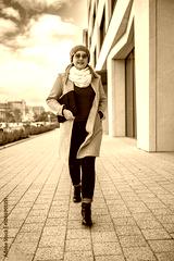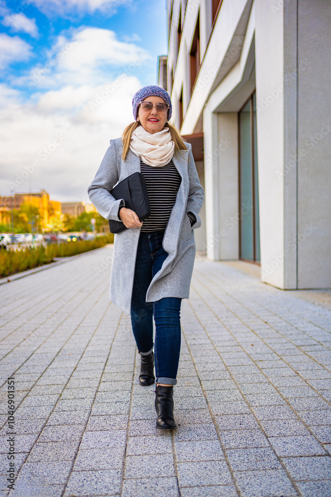 Beautiful middle-aged woman in gray coat, jeans, cream scarf, winter hat and sunglasses walking on sidewalk in modern district of city in autumn. Businesswoman going outdoors. Front view.
