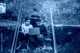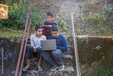 Rural Indian kids sitting together outside their home and using laptop in the village. concept of online education, technology and learning