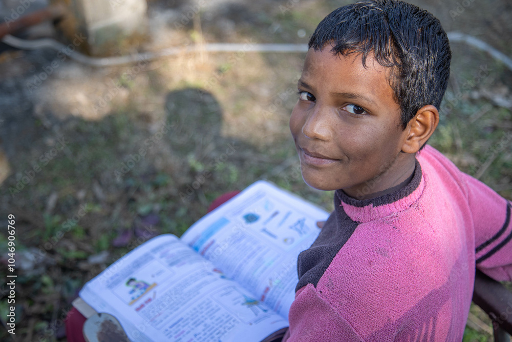 Poor Indian boy sits comfortably in a chair, engrossed in a book, surrounded by greenery. Bright sunlight filters through the leaves, creating a peaceful atmosphere.