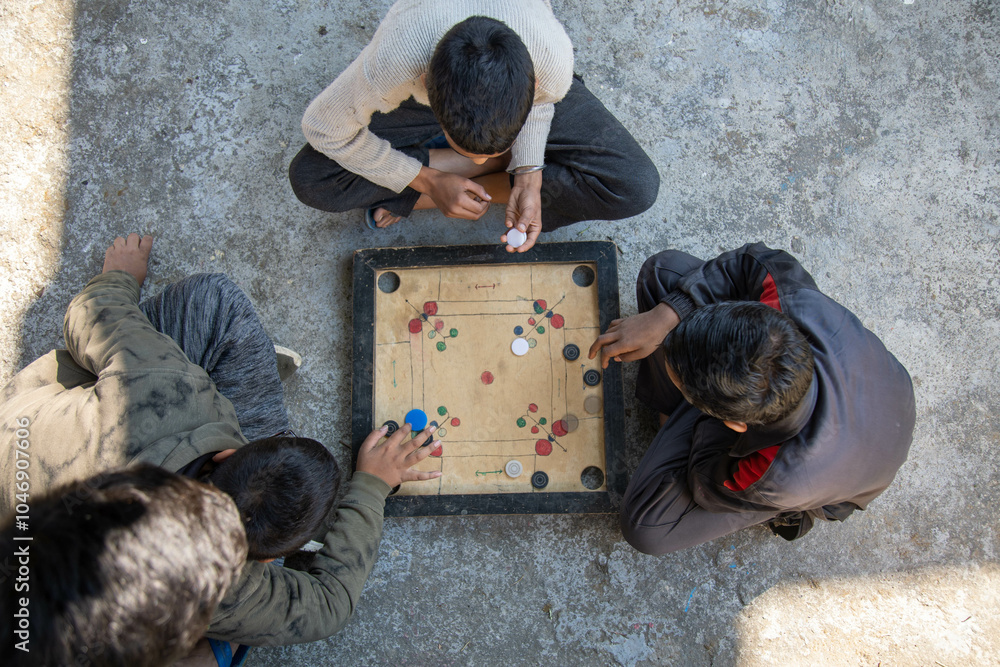 Indian village boys focus intently on a carrom board while playing together in a courtyard, surrounded by pastel-colored walls and a calming atmosphere.
