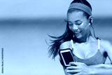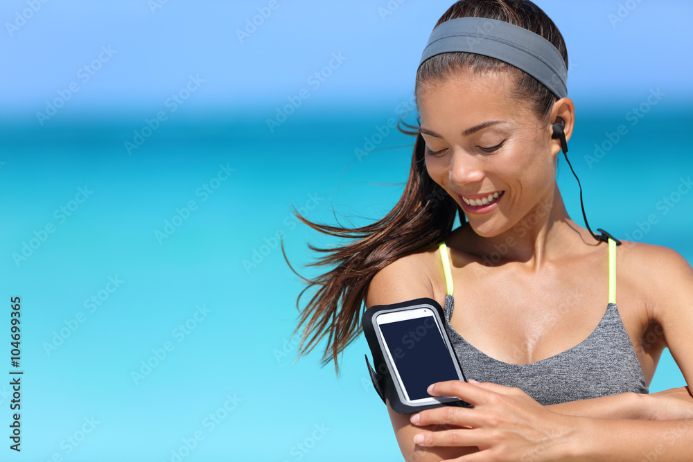 Fit woman using smartphone fitness app on armband. Young Asian female runner touching the display touchscreen on sports arm strap with mobile phone for listening to music or as activity tracker.