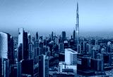 Beautiful modern city architecure at golden sunset. View of Dubai's business bay towers.