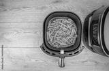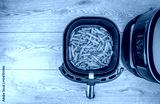 Homemade sweet potato fries roasted in the air fryer. top view. copy space
