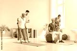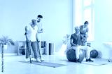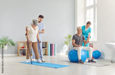 Mature elderly people doing exercises with the help of fitness trainers or health care workers in rehabilitation clinic. Senior retired man and woman exercising for health in gym with physiotherapist