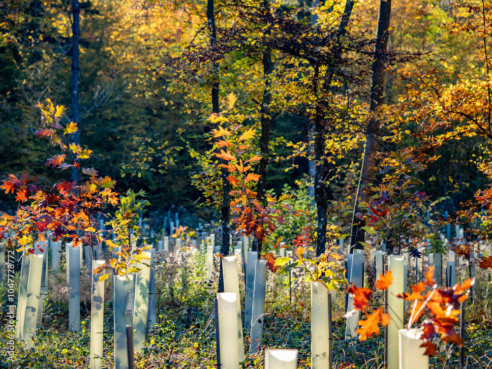 Wiederaufforstung durch anpflanzen junger Laubbäume im Mischwald
