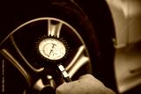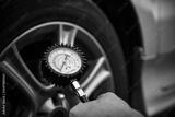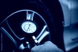 Hand car mechanic holding car tire pressure check equipment tool to checking low tire pressure inflating tires to or refill or air inflate to safety and car care service maintenance inspection.