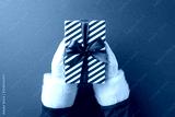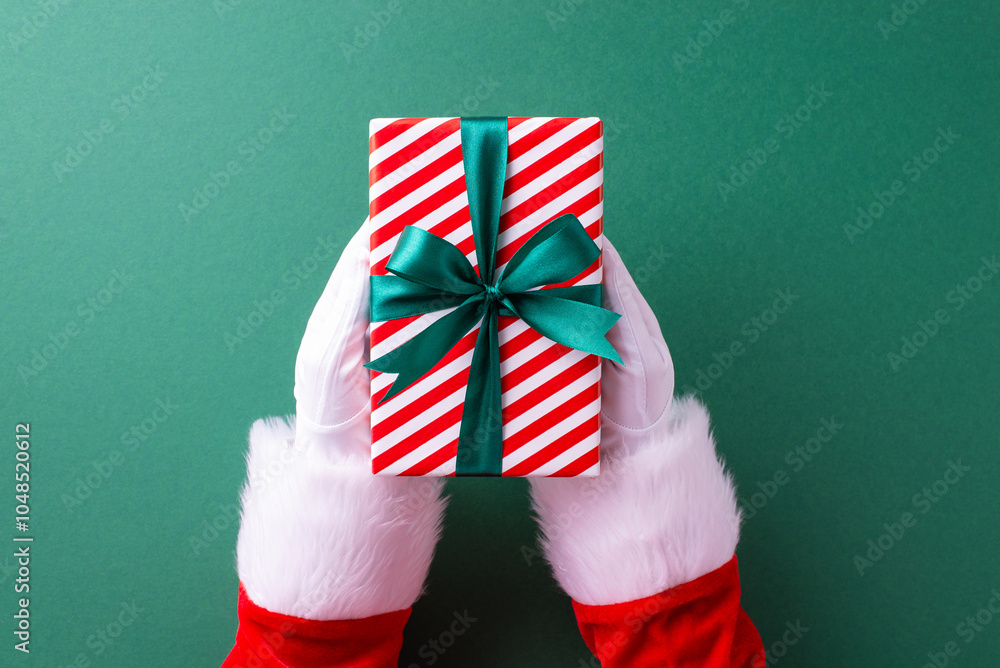 Santa Claus holds a beautifully wrapped Christmas gift with a green ribbon, symbolizing joy and celebration in the holiday season