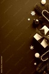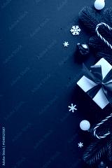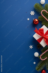 Christmas vertical present with a red ribbon surrounded by festive elements like pine branches, candy canes, and ornaments on a blue background