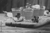 Blue curacao liqueur with lemon on the wooden table