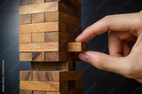 Closeup hand man take one block on The tower from wooden blocks, dark tone.