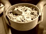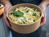 Takeaway food - woman holding orzo noodles in cream sauce with spinach in takeaway box