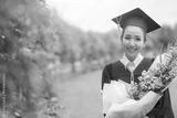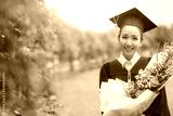 Graduate woman students wearing graduation hat and gown, congratulations for end of study