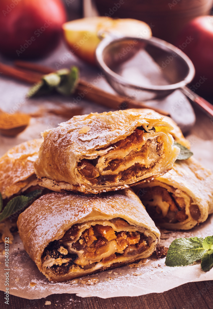 Sliced homemade apple strudel