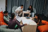 Students working together in a relaxed environment with bean bags, papers, and teamwork. Collaborative learning in a modern study room.