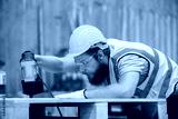 Male engineer carpenter wearing safety uniform and yellow hard hat working using electric nail gun to on wood at workshop manufacturing. Man worker wood warehouse industry.