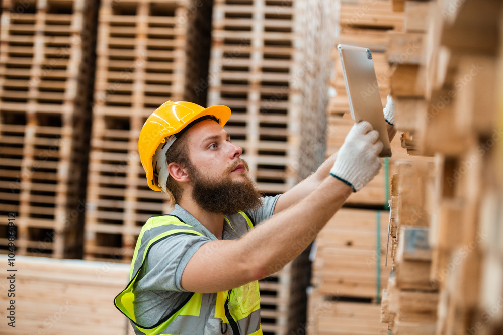 Worker Man with a bearded wearing safety uniform hard hat holding tablet working checking quality wooden at manufacturing wooden. Male carpenter worker wood warehouse industry.