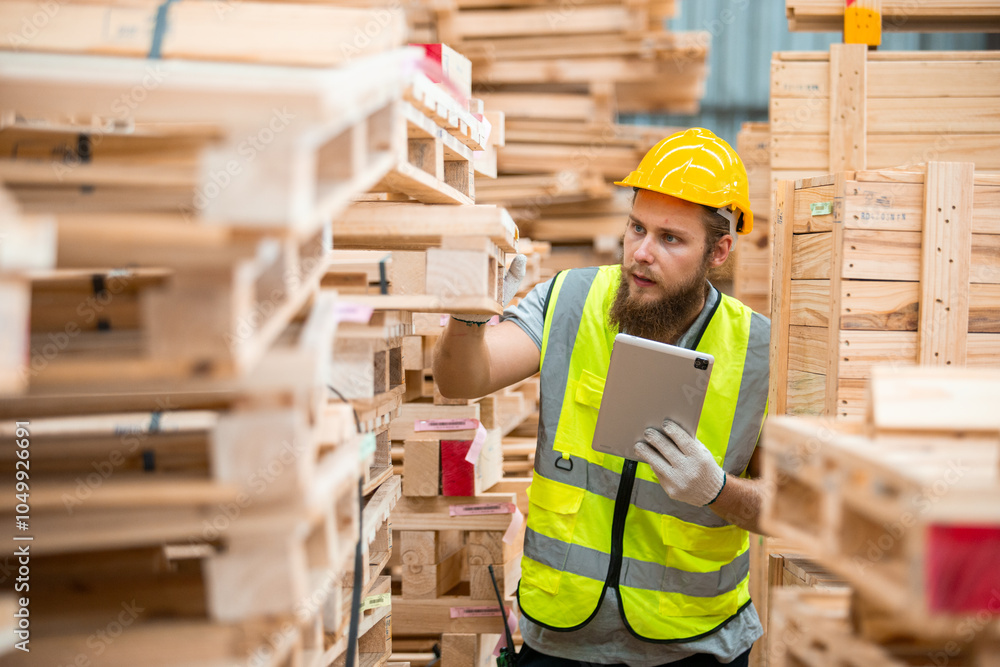 Worker Man with a bearded wearing safety uniform hard hat holding tablet working checking quality wooden at manufacturing wooden. Male carpenter worker wood warehouse industry.