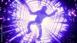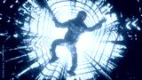 A silhouetted figure floats in a vibrant, swirling tunnel of light, evoking a sense of travel through space and time.