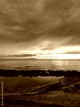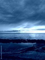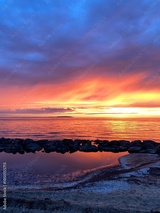 Sunset sky reflecting in the Baltic sea, view from the sandy shore in Sweden.
