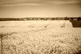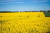 Rapeseed field, oilseed rape blooming in farmland in countryside of Southern Sweden