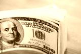 A pile of one hundred US dollar bills on a wooden table