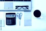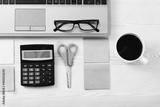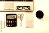 Workspace with cup of coffee and calculator and copy space on wooden table. Top view