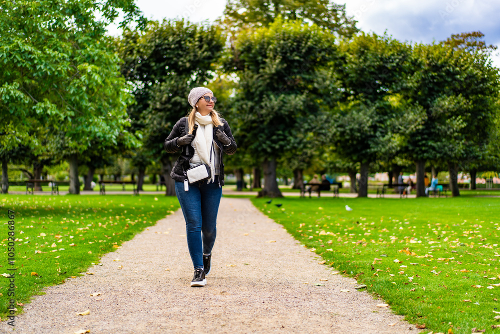Middle-aged beautiful woman tourist in black jacket, jeans, cream sweater, scarf, winter hat, handbag and sunglasses walking in city park in Copenhagen in early autumn. Front view.
