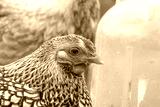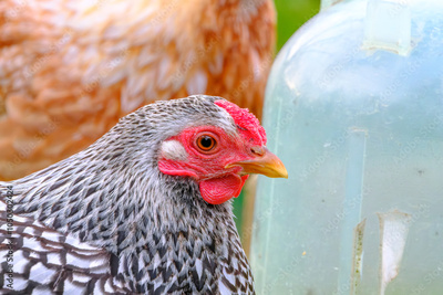 Close-up of a pretty, free range wyandotte hen seen at her drinking trough in a private English garden. Kept free range for there tasty eggs.