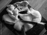 Woman cutting chicken in domestic kitchen. Dividing chicken into parts. Top view.