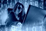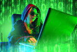 Woman hacker. Girl programmer. Hacker uses laptop to hack internet network. Green binary code behind geek. Woman programmer in hood. Lady in sunglasses. Hacker creates malware. System administrator