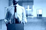 Man with dismissal box in hands. Fired businessman. Guy lost job. Dismissal employee stands in office. Cropped manager needs unemployment benefits. Fired man in formal wear. Labor market crisis