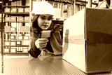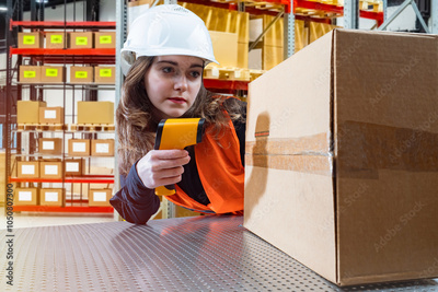 Woman storekeeper with laser barcode scanner. Girl works in warehouse. Employee storage company. Woman supervisor near cardboard box. Young lady storekeeper in helmet. Logistics warehouse worker