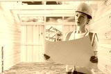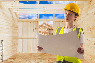 Woman builder. Girl holds architectural plan. Builder under wooden frame house. Architect controls erection of building made of wood. Woman builder in yellow uniform and helmet. Engineer, designer