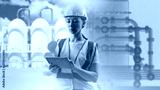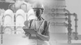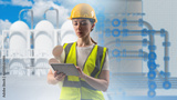 Woman technologist plants. Architect industrial enterprise. Factory technologist with tablet and drawings. Architect in yellow uniform. Manufactory builder near high pressure tanks. Factory employee