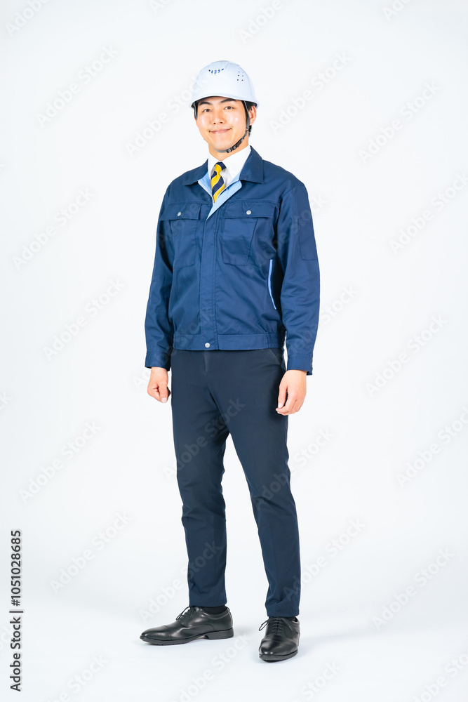 作業員、エンジニア、建設、工事、男性、ヘルメット、日本人、全身、作業服、スタッフ、監督、工務店、企業、会社員、安全、仕事、転職、就職、プロ、ビジネス、ゼネコン、デベロッパー、笑顔、白バック、切り抜き、人材、働く、メンテナンス、点検、ビルメン、検査、建築士、設計士、工場、産業、物流、倉庫、製造業、管理、立つ、自信、信頼、修理、業者、若い、30代、依頼、カメラ目線、写真、人物