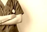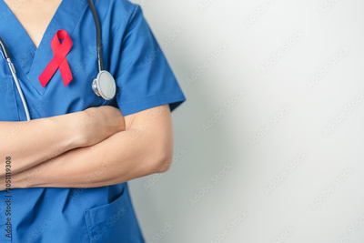 Doctor with Red Ribbon for December World Aids Day, acquired immune deficiency syndrome, multiple myeloma Cancer Awareness month and National Red ribbon week. Healthcare and world cancer day concept