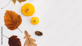 Autumn holiday frame composition with pattern made of leaf, punpkins, dried orange, pine cone on white wooden background. thanksgiving day, halloween eco zero waste concept. Minimal flat lay, top view