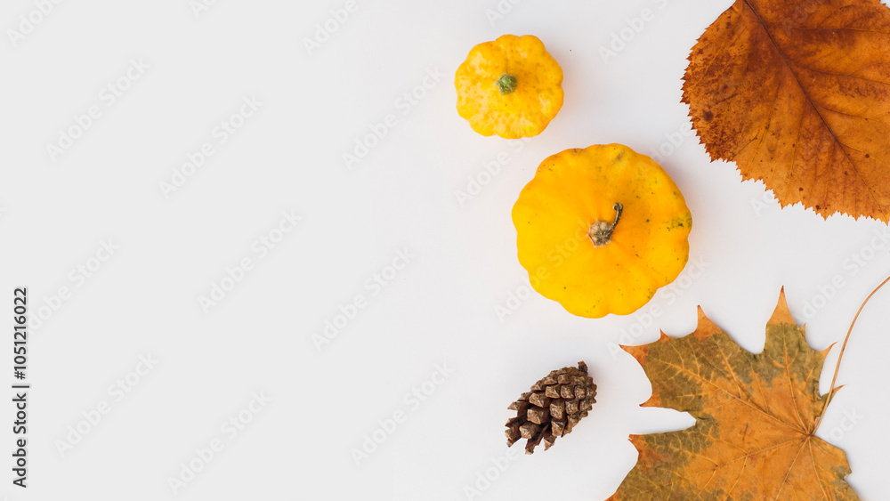 Autumn holiday frame composition with pattern made of leaf, punpkins, dried orange, pine cone on white wooden background. thanksgiving day, halloween eco zero waste concept. Minimal flat lay, top view
