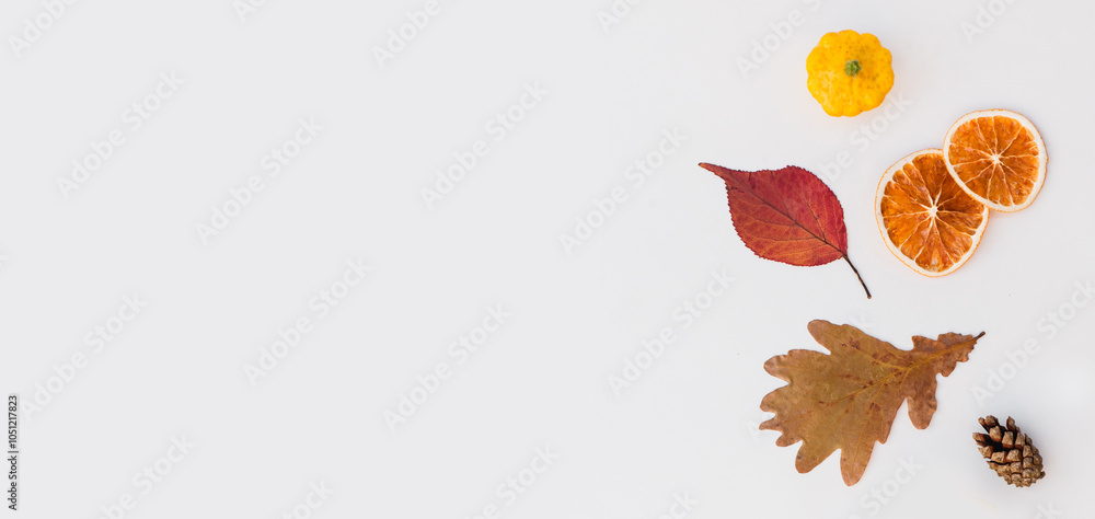 Autumn holiday frame composition with pattern made of leaf, punpkins, dried orange, pine cone on white wooden background. thanksgiving day, halloween eco zero waste concept. Minimal flat lay, top view