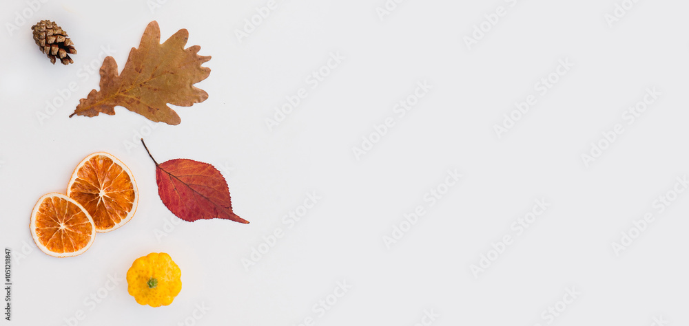 Autumn holiday frame composition with pattern made of leaf, punpkins, dried orange, pine cone on white wooden background. thanksgiving day, halloween eco zero waste concept. Minimal flat lay, top view