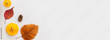 Autumn holiday frame composition with pattern made of leaf, punpkins, dried orange, pine cone on white wooden background. thanksgiving day, halloween eco zero waste concept. Minimal flat lay, top view